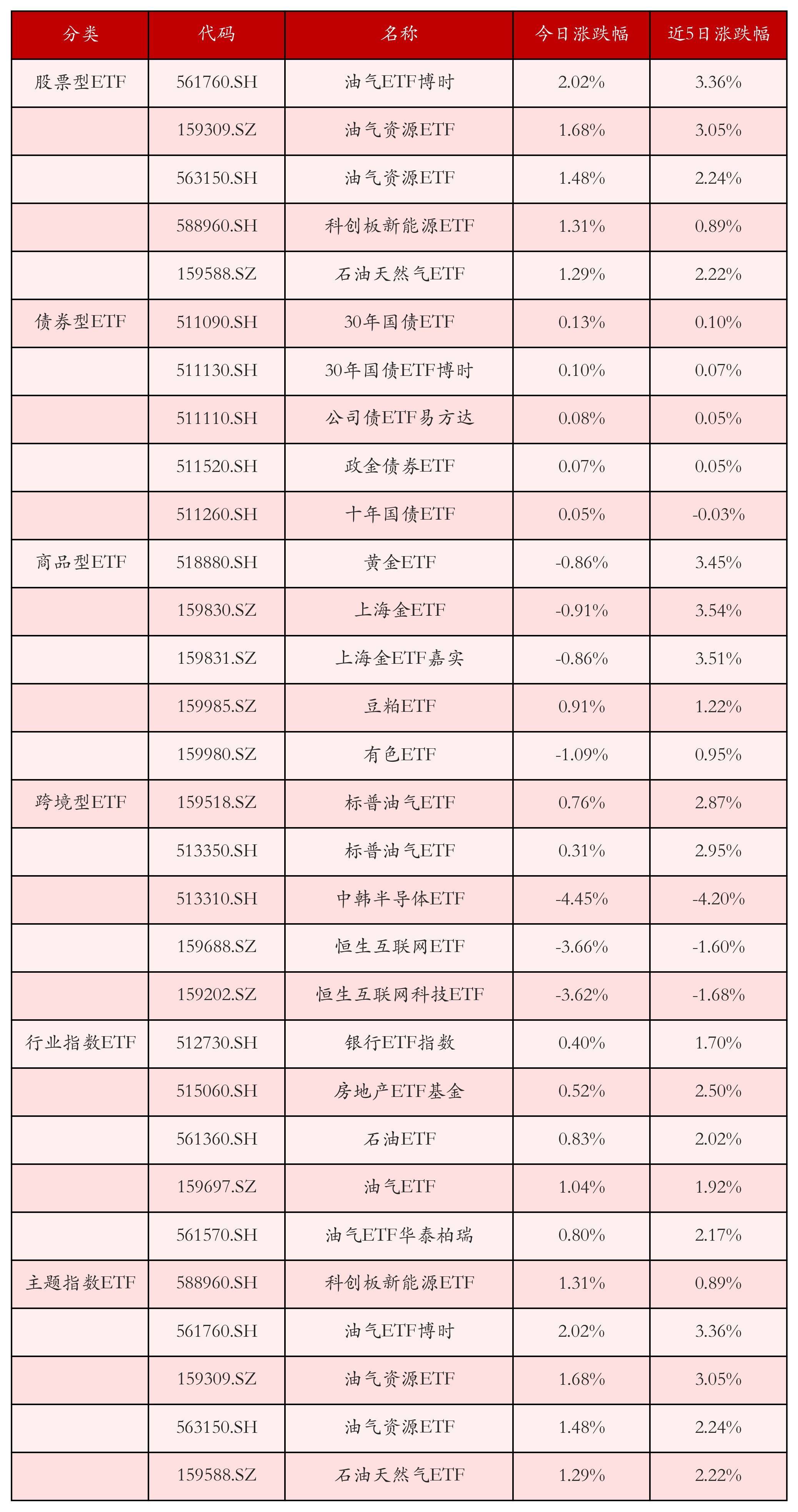 从不同投资种类、行业、主题的ETF产品中找出今日走势行情排名前5的ETF基金,今日涨幅靠前的ETF产品如下表所示。股票型ETF中涨跌幅排名前3位的ETF产品分别为油气ETF博时(561760.SH)、油气资源ETF(159309.SZ)和油气资源ETF(563150.SH),今日收益率分别为2.02%、1.68%和1.48%。