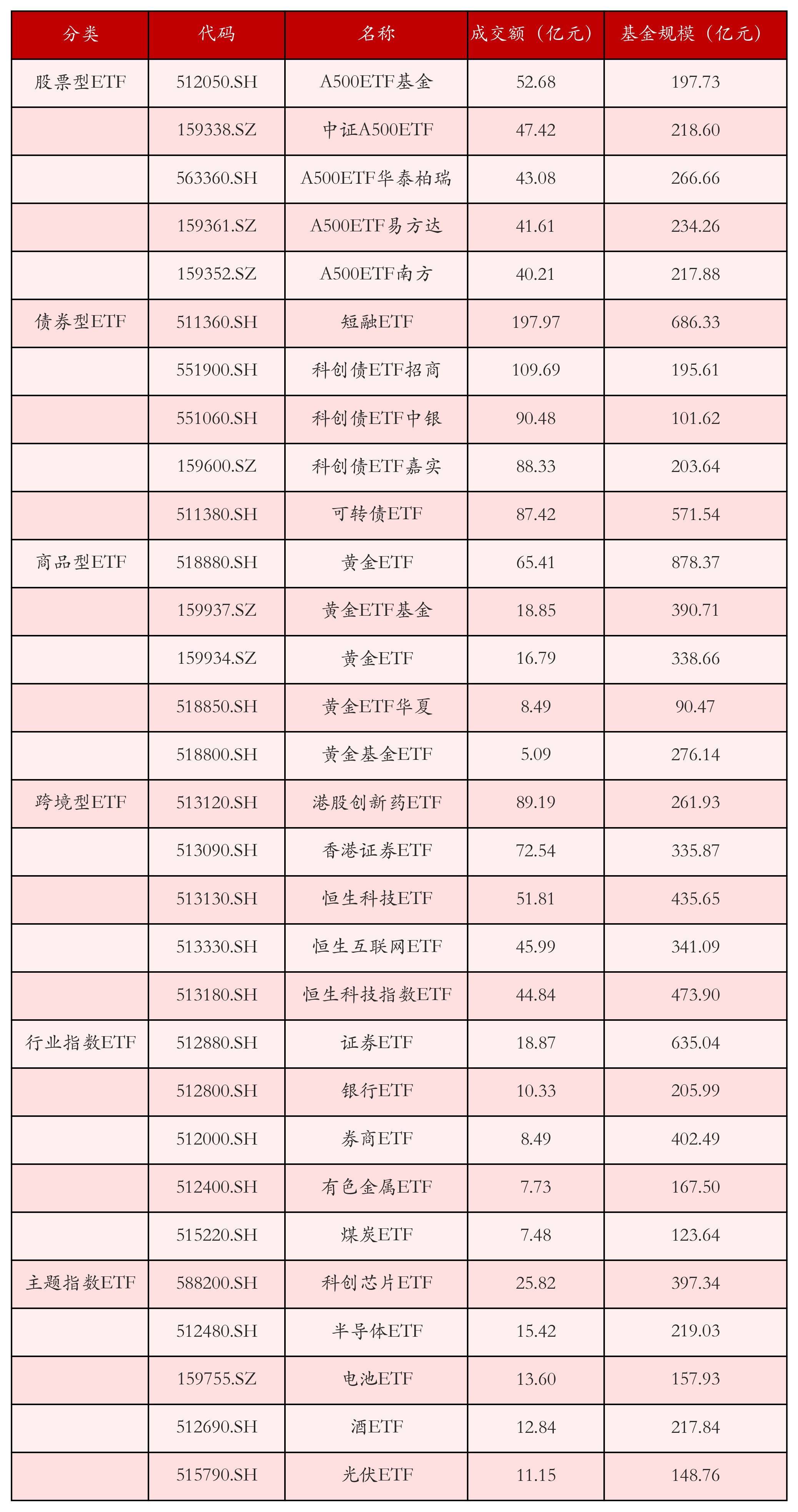 基于成交额对各类ETF今日的成交情况进行统计,成交额靠前的ETF产品如下表所示。股票型ETF中成交额排名前3位的ETF产品分别为A500ETF基金(512050.SH)、中证A500ETF(159338.SZ)和A500ETF华泰柏瑞(563360.SH),今日成交额分别为52.68亿元、47.42亿元和43.08亿元。