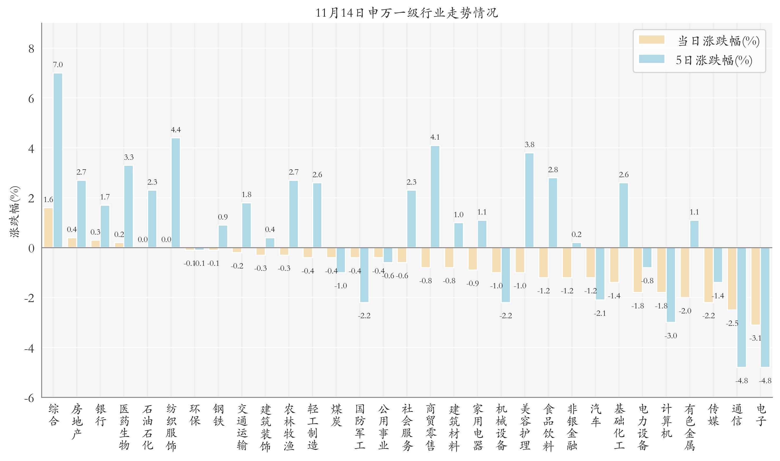 统计今日全部申万一级行业涨跌幅情况,综合、房地产与银行今日走势排名靠前,日涨跌幅分别为1.58%、0.39%与0.26%,电子、通信与传媒的走势排名靠后,日涨跌幅分别是-3.09%、-2.46%与-2.16%;近5个交易日综合、纺织服饰与商贸零售的走势排名靠前,近5日涨跌幅分别为6.99%、4.41%与4.06%,电子、通信与计算机的走势排名靠后,近5日涨跌幅分别为-4.77%、-4.77%与-3.03%。